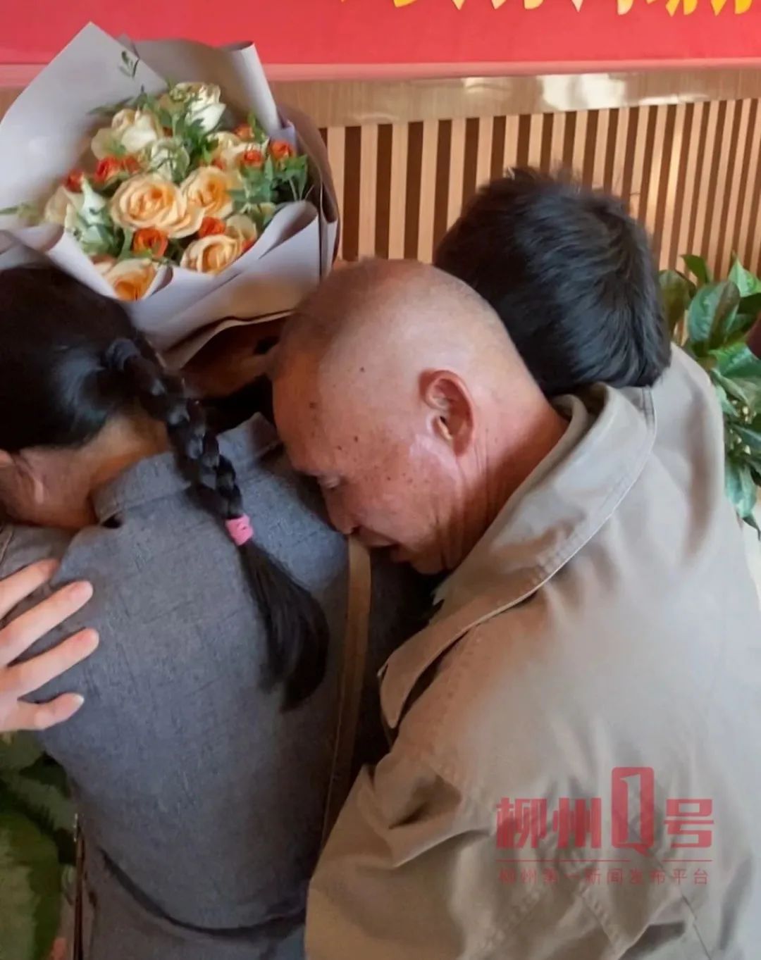 11日,在市公安局柳北分局组织开展的“让爱重聚 助力团圆”认亲团圆仪式上,小李手捧鲜花,与亲生父母覃以新夫妻俩深情相拥。