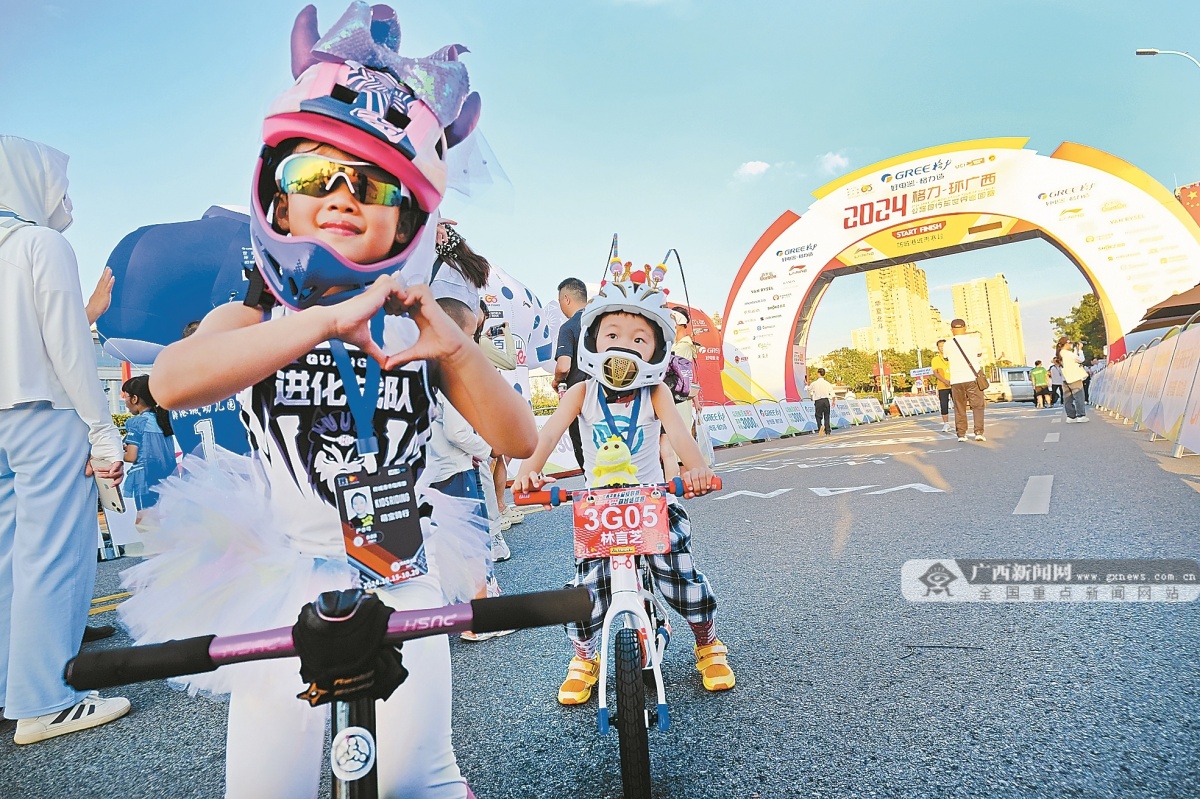 10月14日,参加2024年环广西公路自行车世界巡回赛萌宝骑行比赛的孩子们在防城港赛段适应场地,并祝愿赛事成功举办。记者 周军 摄