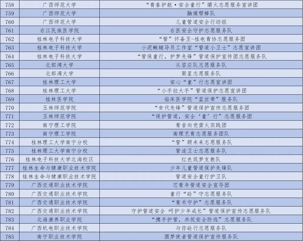 2024年关爱行动“少年儿童安全守护计划”管道保护宣传志愿服务团队广西入选名单