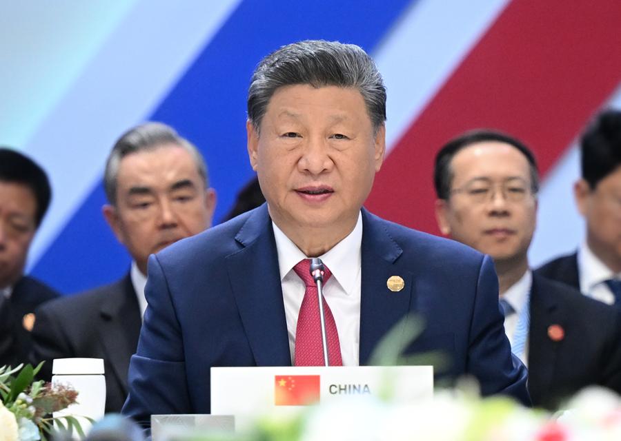 习近平强调,世界越是动荡,我们越要高举和平、发展、合作、共赢旗帜,淬炼金砖成色,展现金砖力量。要发出和平之声,倡导对话而不对抗、结伴而不结盟的新型安全。要共谋发展之路,倡导普惠包容的经济全球化,坚守共同发展的大道。要夯实合作之基,深化农业、能源、矿产、经贸等传统领域合作,拓展绿色低碳、人工智能等新兴领域合作,维护贸易投资和金融安全。