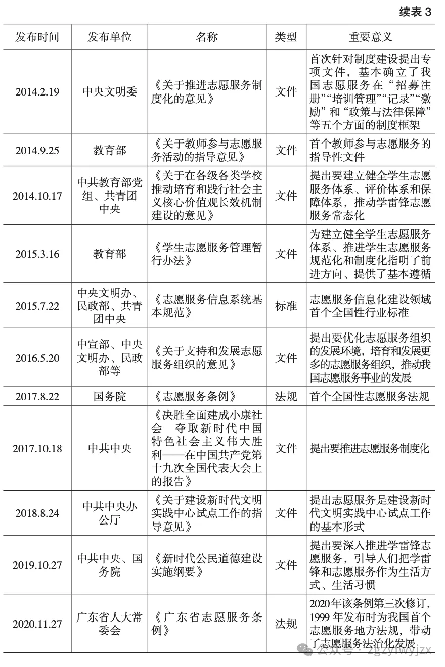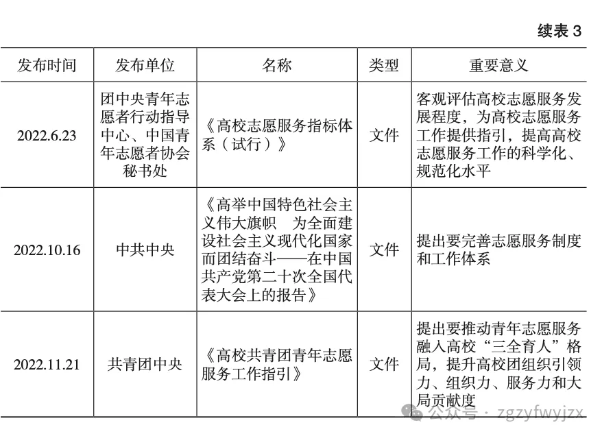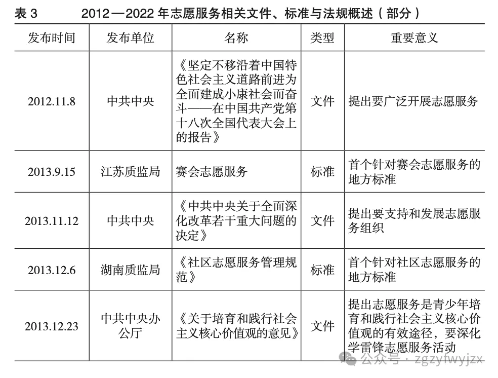 中国特色社会主义进入新时代,我国志愿服务也越发凸显因时、因地制宜的制度逻辑。笔者整理了2012—2022年期间与志愿服务相关的重要文件与法规标准(见表3),发现志愿服务已成为全面建设社会主义现代化国家的重要战略之一。从大型赛会到社会治理、从培育践行社会主义核心价值观到公民道德建设、从社区服务到新时代文明实践,正是志愿服务规范性文件和法规标准的不断出台与相互融合,为大学生奉献自我、服务社会、报效国家提供了有力支撑。