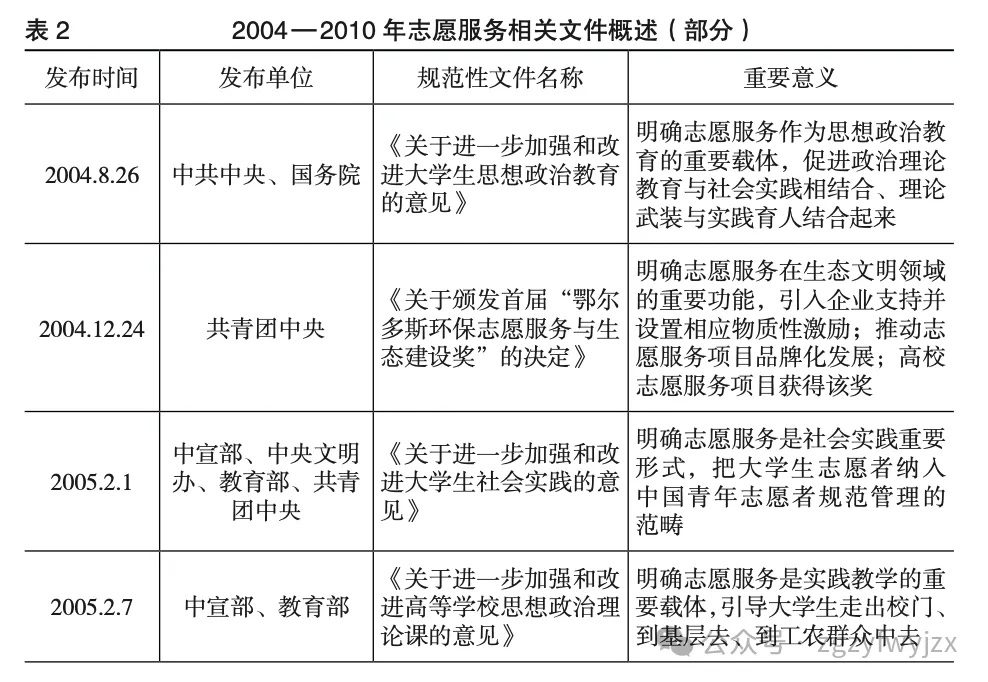 在我国志愿服务制度化进程中,高校始终倡导主体导向、双向奔赴、按需供给。高校与社会、高校与学生、志愿者与服务对象,是高校志愿服务中最为重要的三对主体关系。通过志愿服务,高校能够有效履行人才培养和社会服务的重要职责;大学生志愿者能够得到自我实现、外部嘉许、能力提升、精神境界升华;服务对象与社会则能满足其迫切的现实需求。因此,志愿服务制度建设的核心就是确保各主体均能达成以上理想状态,彰显以人为本的主体性特征。同时,中共中央、国务院于2004年发布的《关于进一步加强和改进大学生思想政治教育的意见》明确指出,志愿服务是新形势下大学生思想政治教育的有效途径。这有效推动了高校志愿服务及其制度建设的发展,笔者整理了2004—2010年间与志愿服务相关的重要文件(见表2),发现这些文件环环相扣、关系密切,是高校通过志愿服务实现立德树人根本任务和服务社会重要职能的全方位指南,既强调了实践育人的独特价值,又指明了服务领域的广泛性与针对性相统一,还通过制度建设有效维护了大学生志愿者的正当权益。