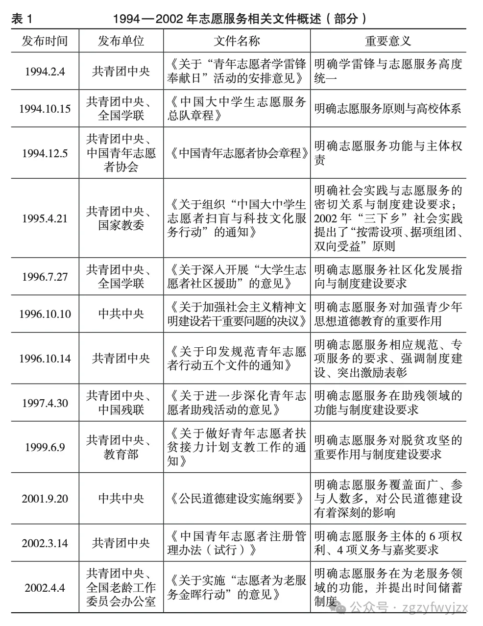 为更清晰地展现我国高校志愿服务制度文化从无到有的演进过程及其重要内涵,笔者整理了1994—2002年期间的志愿服务重要文件(见表1,按时间排序)。从中可以发现,志愿服务出现制度文件、涉及单位与覆盖领域的“三增多”现象,并在整体上形成了制度化、组织化与社会化相统一的发展路径。在此阶段,我国志愿服务立足于社会迫切需求,在建立组织与专门项目的基础上,通过制度建设以保证有序供给与按需供给的实现。同时,党和国家高度重视志愿服务与道德教育(建设)间的密切关系,强调志愿服务应发挥自身在道德实践上的载体功能与广泛参与性。