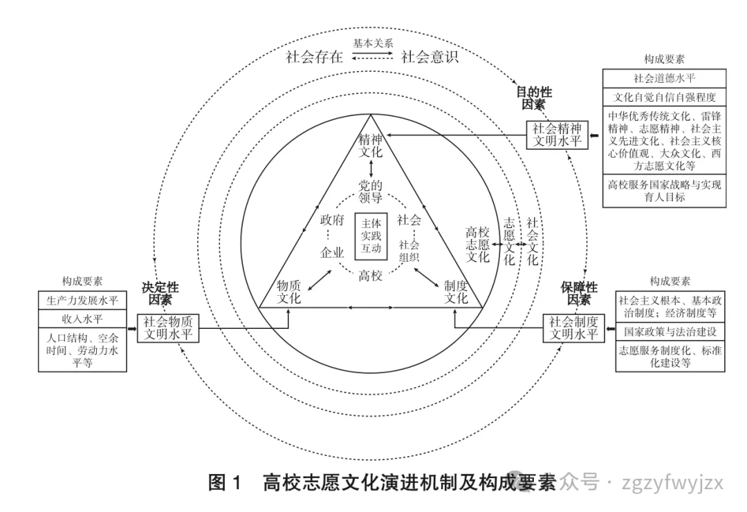 高校志愿文化的三维演进过程、机理与要素,就表现为以主体(包括政党、政府、社会、企业、社会组织、高校)实践与互动为根本“动因”,在中国特色社会主义社会的存在“框架”下,不断生成含有志愿服务特质的社会意识,此种社会意识又作用于社会存在。社会存在与社会意识的双向作用,在宏观层面表现为物质文明决定精神与制度文明,精神文明引领物质与制度文明的发展,制度文明保障物质文明与精神文明的实现,物质、精神、制度文明分别是高校志愿文化生成的决定性、目的性、保障性因素。志愿文化受到宏观要素的作用,在高校形成相应物质、制度、精神文化并不断演进,高校以立德树人为根本任务,更为注重志愿服务精神文化的建设,一方面充分融合多元文化要素,另一方面始终坚持党的领导,将服务国家战略作为重要指向。高校志愿服务的精神文化引领自身物质与制度文化的发展,国家层面的政策和志愿服务制度化、法制化、标准化发展,直接推动了高校志愿服务制度文化的建设与发展,物质文化则承载并展现着精神与制度文化。