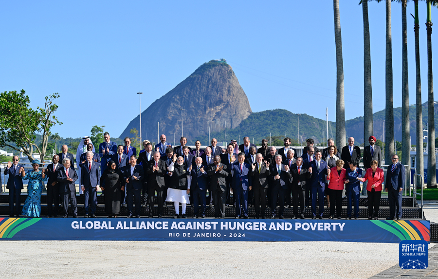 当地时间11月18日上午,国家主席习近平在巴西里约热内卢出席二十国集团领导人第十九次峰会。峰会把“构建公正的世界和可持续的星球”作为主题,并决定成立“抗击饥饿与贫困全球联盟”。这是习近平同与会领导人共同参加巴方发起的“抗击饥饿与贫困全球联盟”合影。新华社记者 李学仁 摄