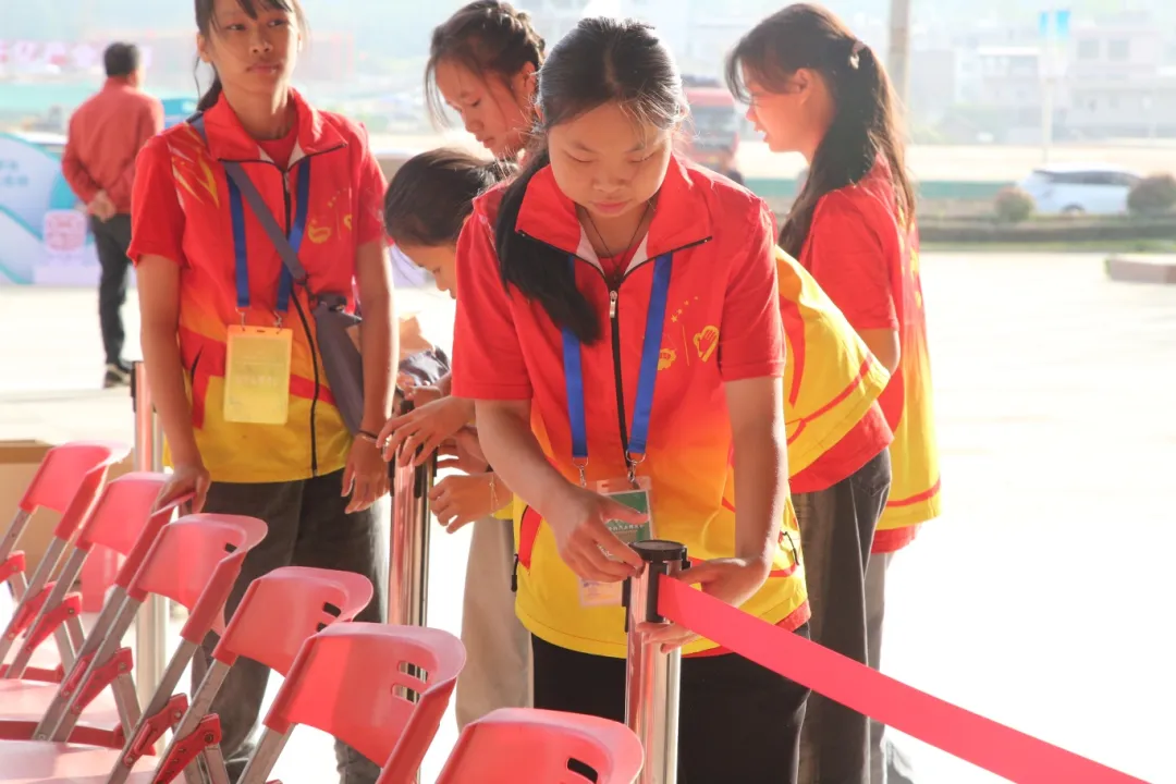 玉林市机电工程学校青年志愿者“小青芒”协助发放会议座位表并引导嘉宾入座,做好活动现场的秩序引导,为嘉宾解答疑虑,提供贴心服务。