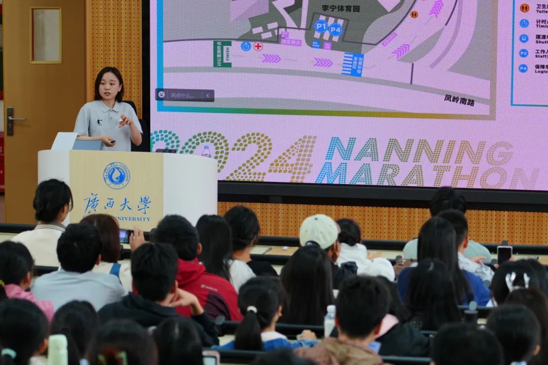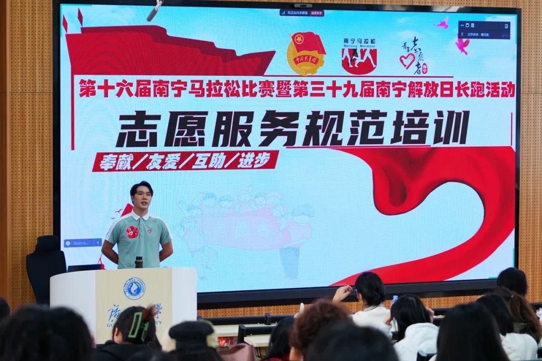 自11月22日起南宁马拉松比赛组委会组织“小青芒”陆续在广西大学、广西民族大学、南宁学院等8所高校开展13场志愿者培训会。11月23日,广西大学的690名南马志愿者“小青芒”参加志愿服务培训。会上,培训工作人员就赛事概况、岗位细则、志愿服务礼仪规范、心理素养等方面进行了全面的讲解,进一步提升“小青芒”的志愿服务水平。让我们共同期待“小青芒”们亮相南马,用优质的服务一起共赴奔跑盛宴~