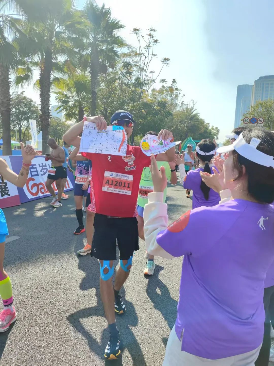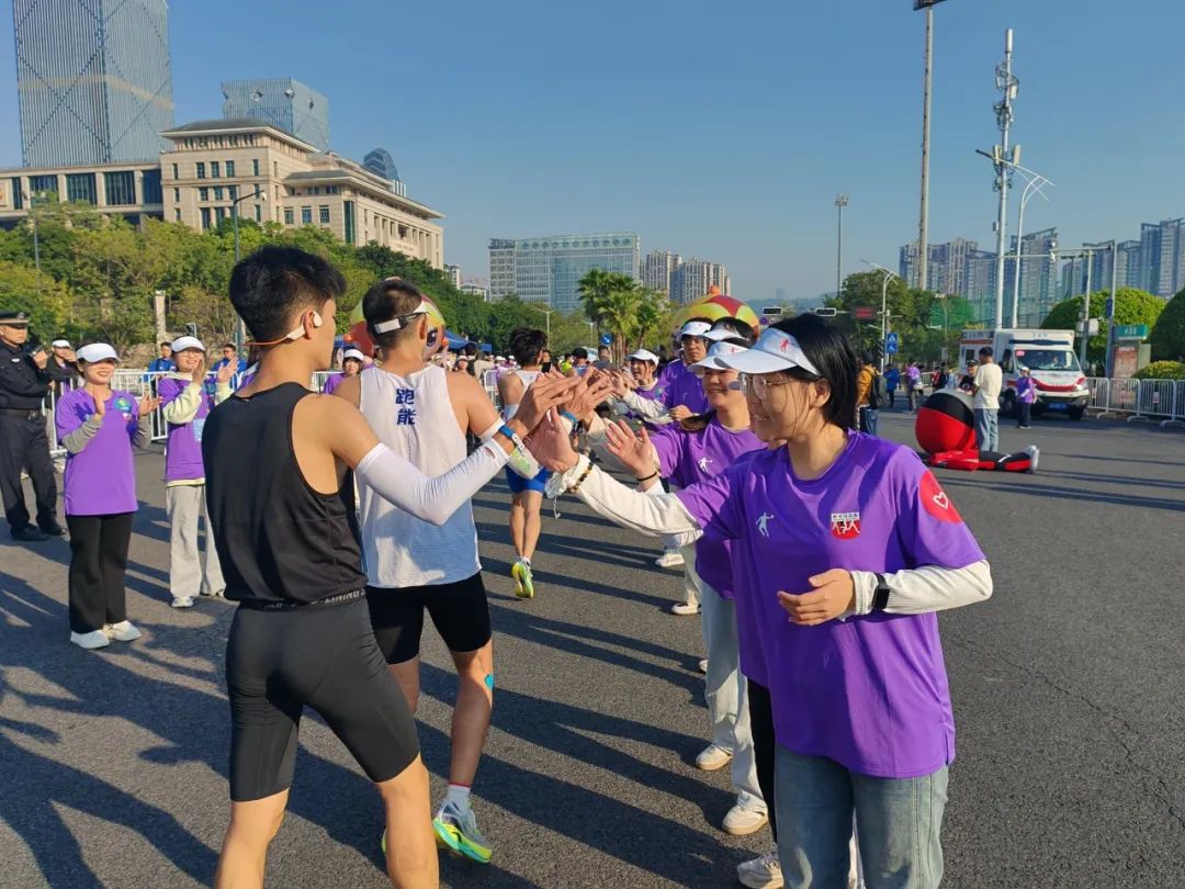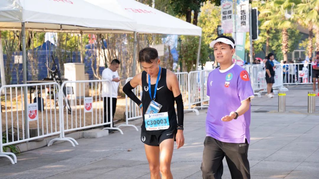 在补给站,“小青芒”们熟练地递上饮用水、香蕉等能量补给品,并用鼓励的话语为选手们加油打气。赛道旁,“小青芒”们成为一道亮丽的风景线,每当有选手经过,他们都会送上鼓励,为选手加油助威,为选手们增添无限动力。来自广西体育高等专科学校的青年志愿者“小青芒”陈屿夕感慨道:“能够成为‘小青芒’的一员,我感到无比荣幸。虽然工作繁忙,但内心充满成就感。每当看到选手们冲过终点的瞬间,我感觉所有的付出都是值得的!”
