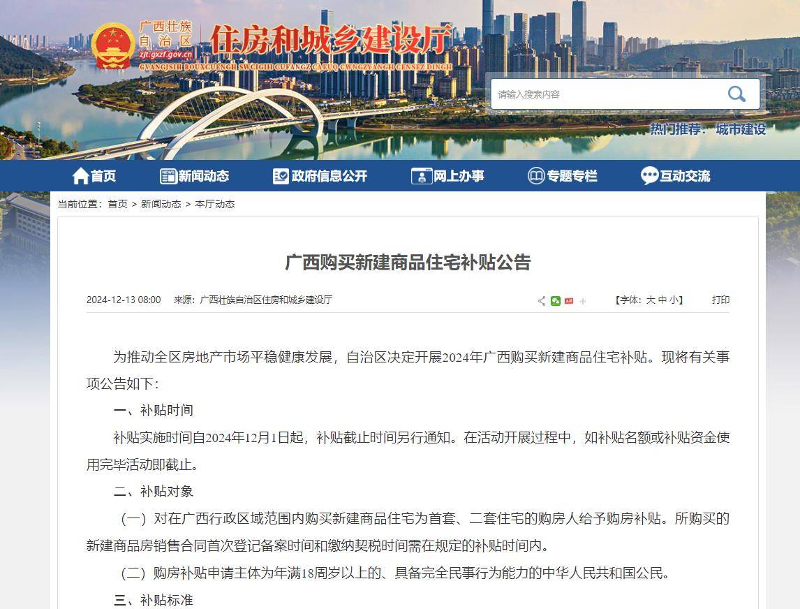 为推动全区房地产市场平稳健康发展,广西决定开展2024年广西购买新建商品住宅补贴。补贴实施时间自2024年12月1日起,补贴截止时间另行通知。在活动开展过程中,如补贴名额或补贴资金使用完毕活动即截止。