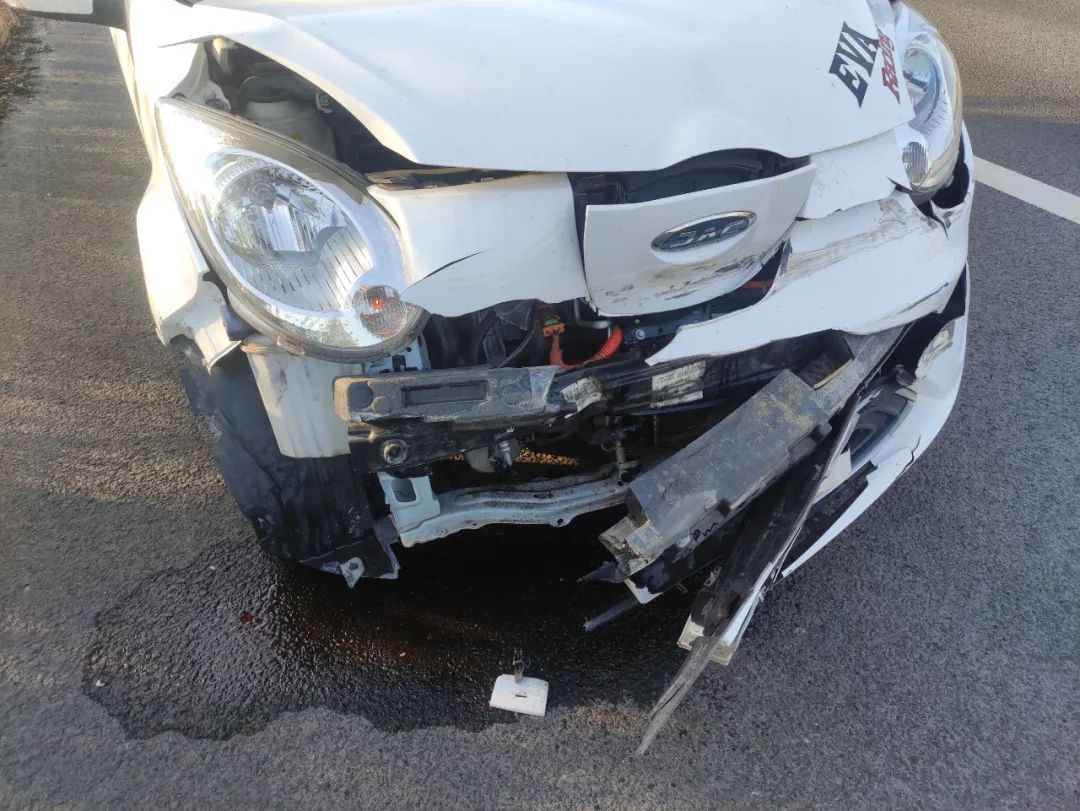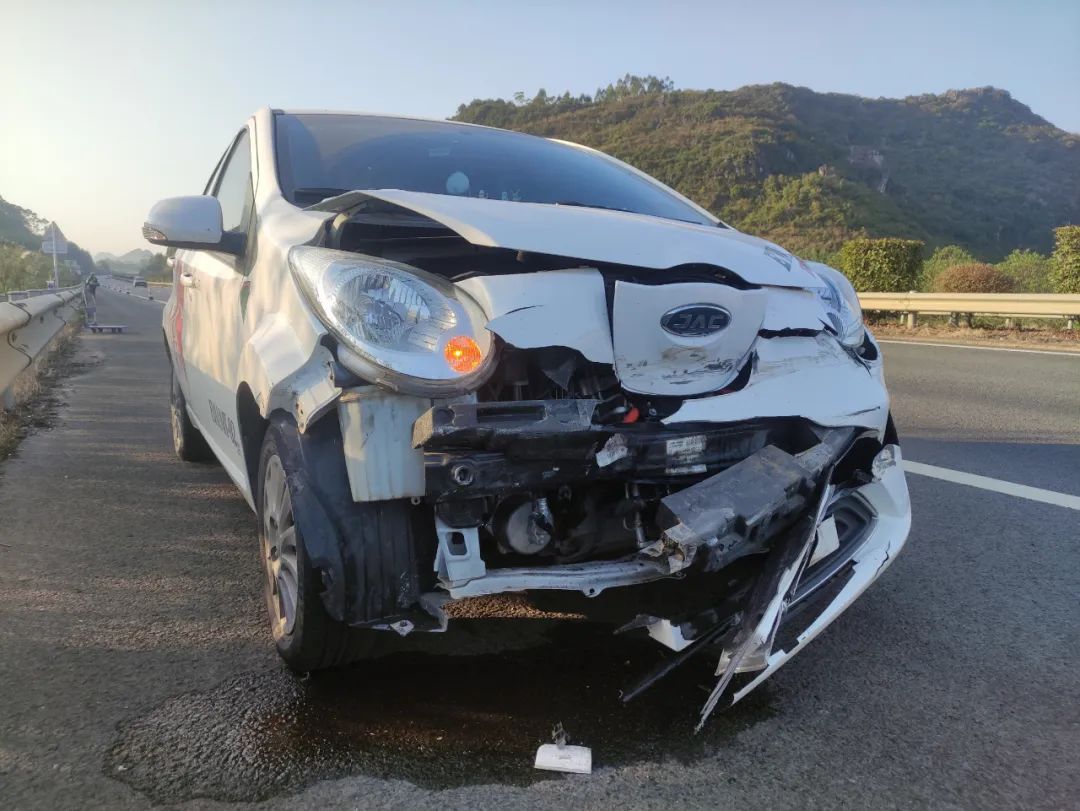 经询问,当天驾驶员唐某驾驶桂B籍白色小型新能源轿车,从柳州出发去贵港,行驶至事发路段时,猛然看到慢车道上有一个障碍物,为了躲避唐某一时慌忙变向时用力过猛,致使车辆失控撞上道路护栏。好在唐某按规定系了安全带,并无大碍。