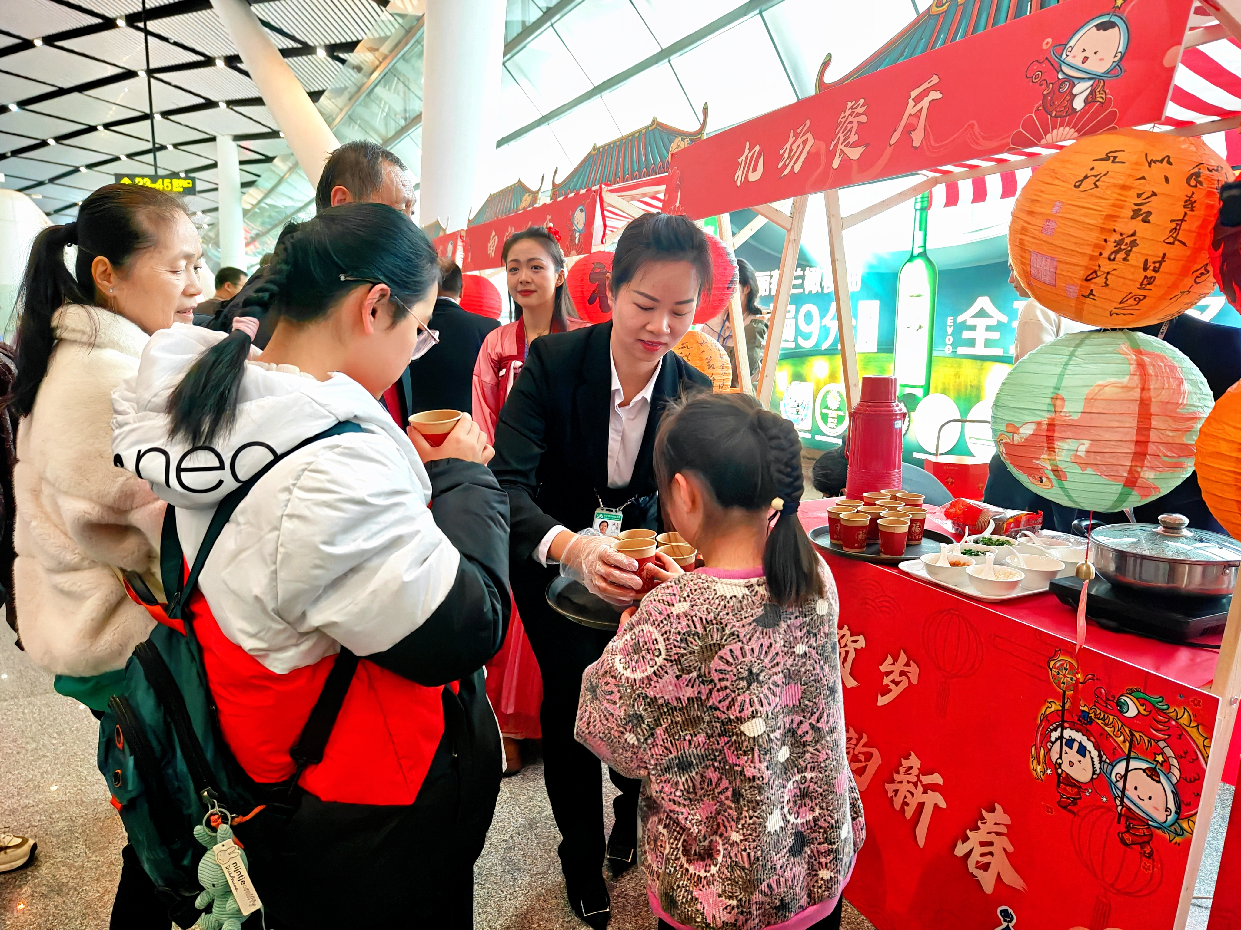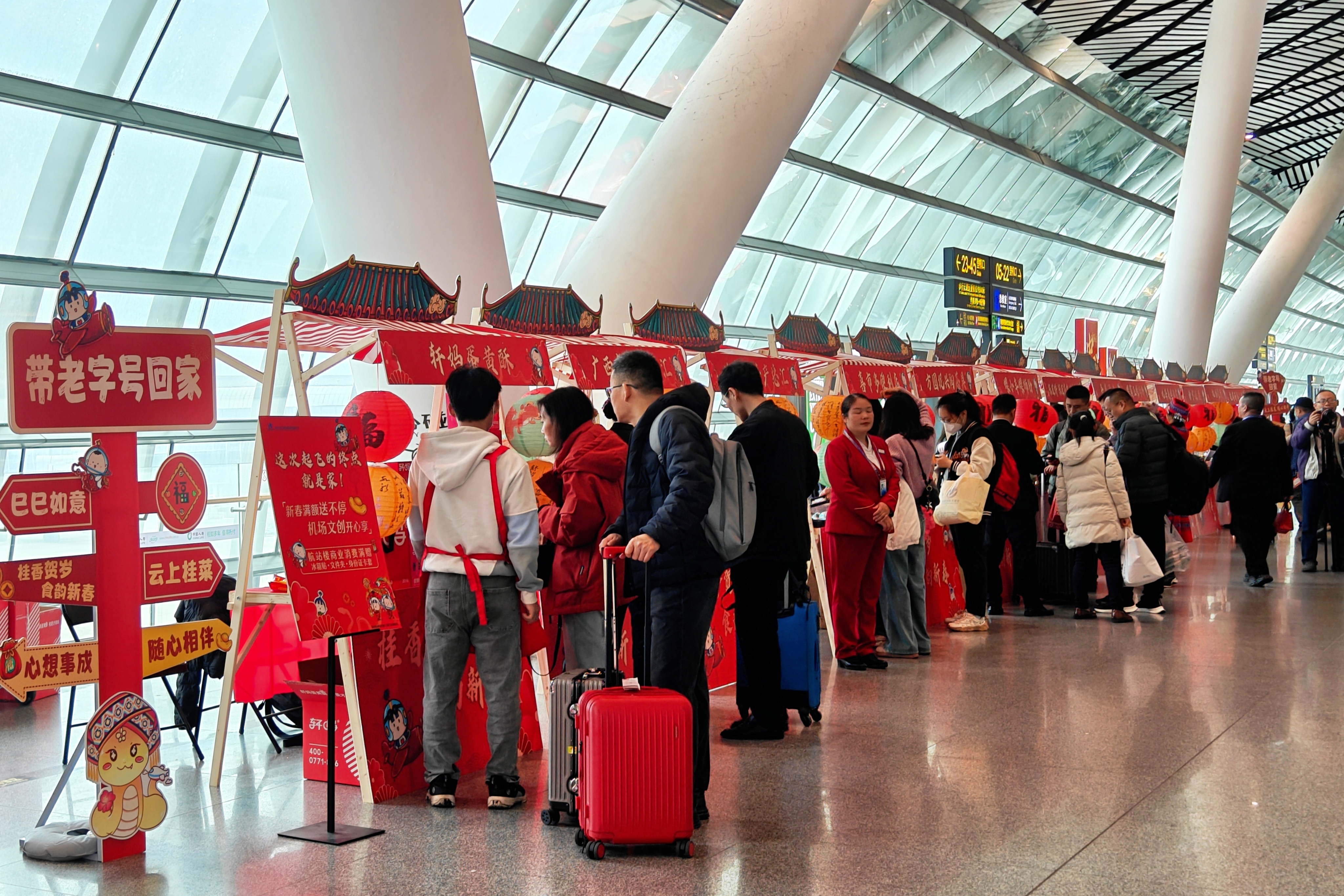 1月22日,南宁机场联合广西壮族自治区商务厅在南宁机场T2航站楼举办的“桂香贺岁,食韵新春”市集活动正式拉开帷幕,活动首日吸引众多旅客参与。