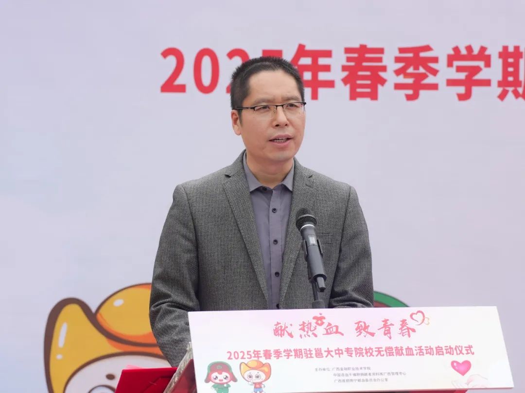 3月11日,2025年春季学期驻邕大中专院校无偿献血活动启动仪式在我校西校区一站式学生社区广场举办。我校党委书记李高岩出席活动并讲话,自治区教育厅、自治区卫生健康委、共青团广西区委、中华骨髓库广西分库、南宁市卫健委等单位相关领导及各驻邕院校师生代表等300多人参加了启动活动。启动仪式由我校党委副书记、纪委书记刘华政主持。