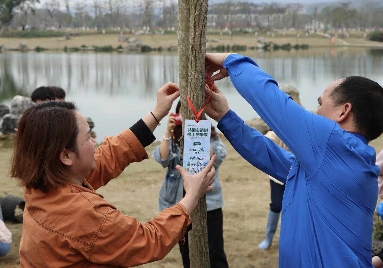 活动当天,崇左市麦那湖公园内绿意盎然,现场气氛热烈而融洽,中越两国青年代表齐聚一起,挥锹铲土、扶苗浇水,种下了象征友谊与合作的树苗,共同为“中越青年友谊林”揭牌。此次植树活动践行习近平生态文明思想,不仅是一次生态环保行动,更是中越两国青年友好交流的生动实践。参与活动的青年们纷纷表示,通过亲手种下树苗,深刻体会到保护生态环境的重要性,同时也感受到中越两国青年之间的深厚情谊。