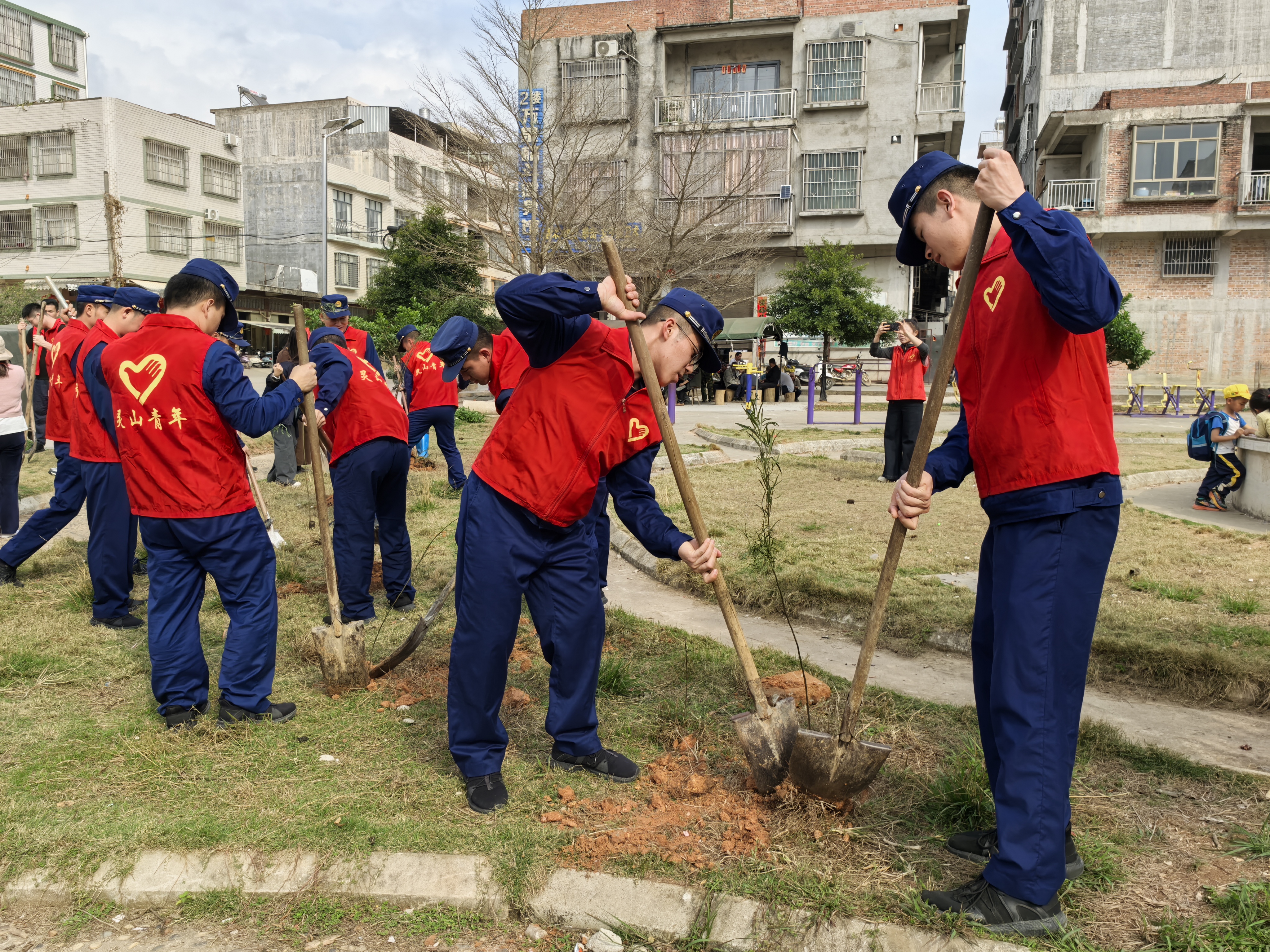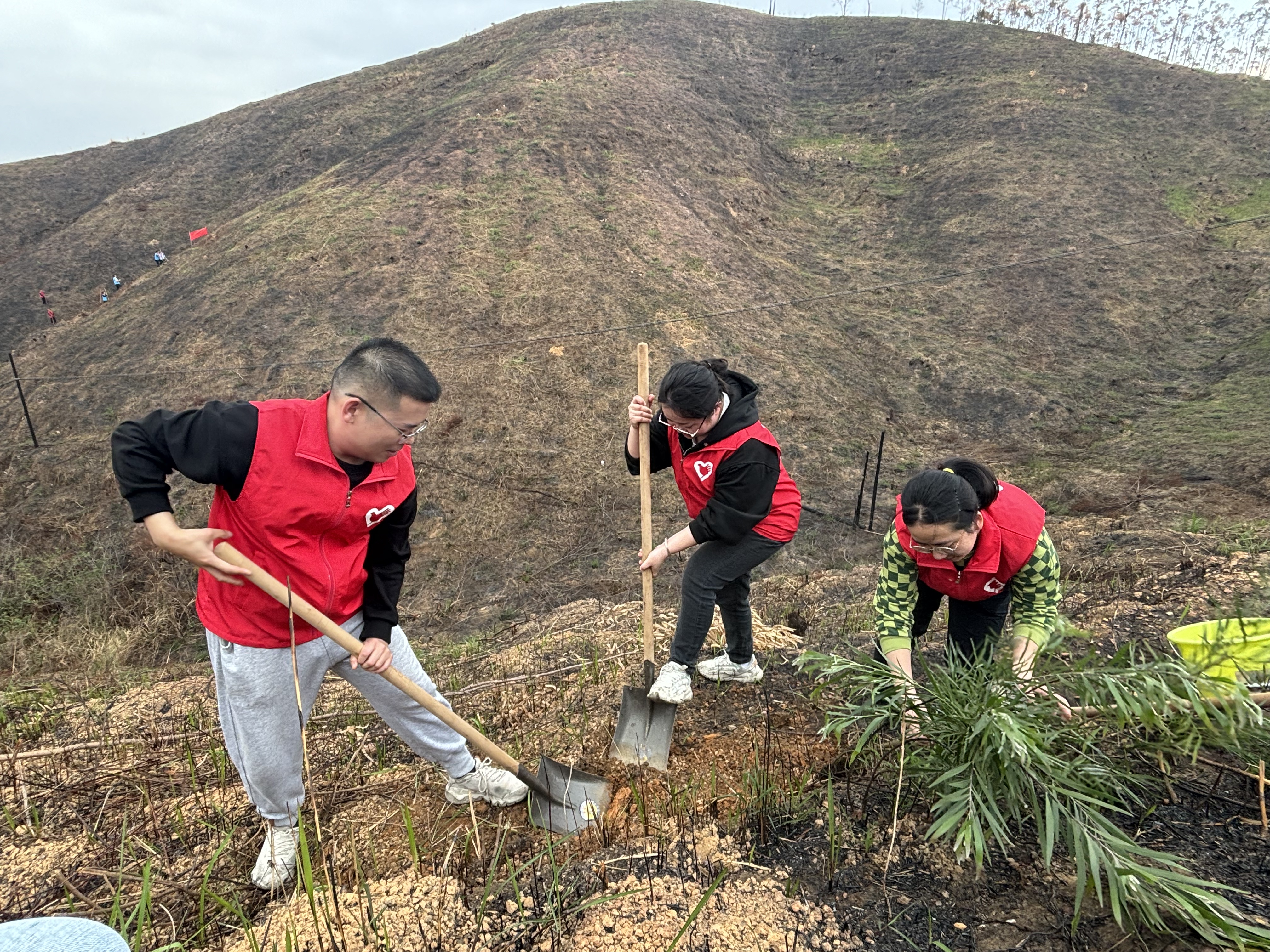 党旗引领方向,团旗凝聚力量,“志愿红”与“火焰蓝”交织共绘春色长卷。系着鲜艳红领巾的少先队员提桶浇水,身着红色马甲的青年志愿者们,肩扛树苗、手持铁锹,步伐矫健地穿梭于山林间,挥锹挖坑、扶苗、培土、浇水,动作利落,一气呵成,百余株相思树、炮仗花幼苗绿意盎然,光秃的山坡悄然换上春装。