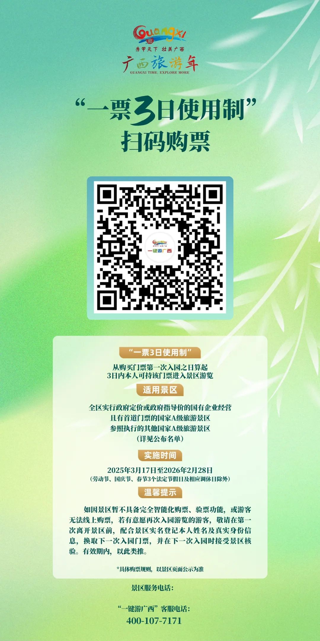 活动期间,游客可通过“一键游广西”APP、微信或支付宝上的“一键游广西”小程序(可在景区现场扫“一键游广西”小程序二维码)及携程、美团、同程等合作渠道,用真实身份信息购买“一票3日使用制”景区首道门票。
