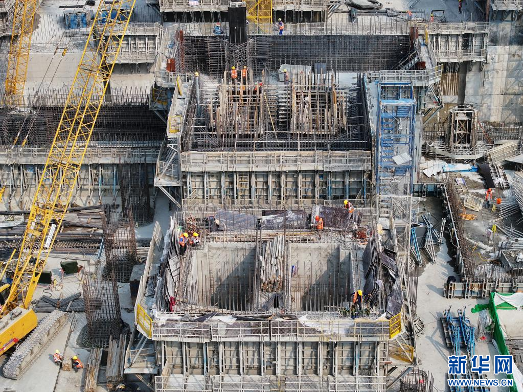 建设者在广西平陆运河企石枢纽建设现场施工(3月19日摄,无人机照片)。新华社记者 周华 摄