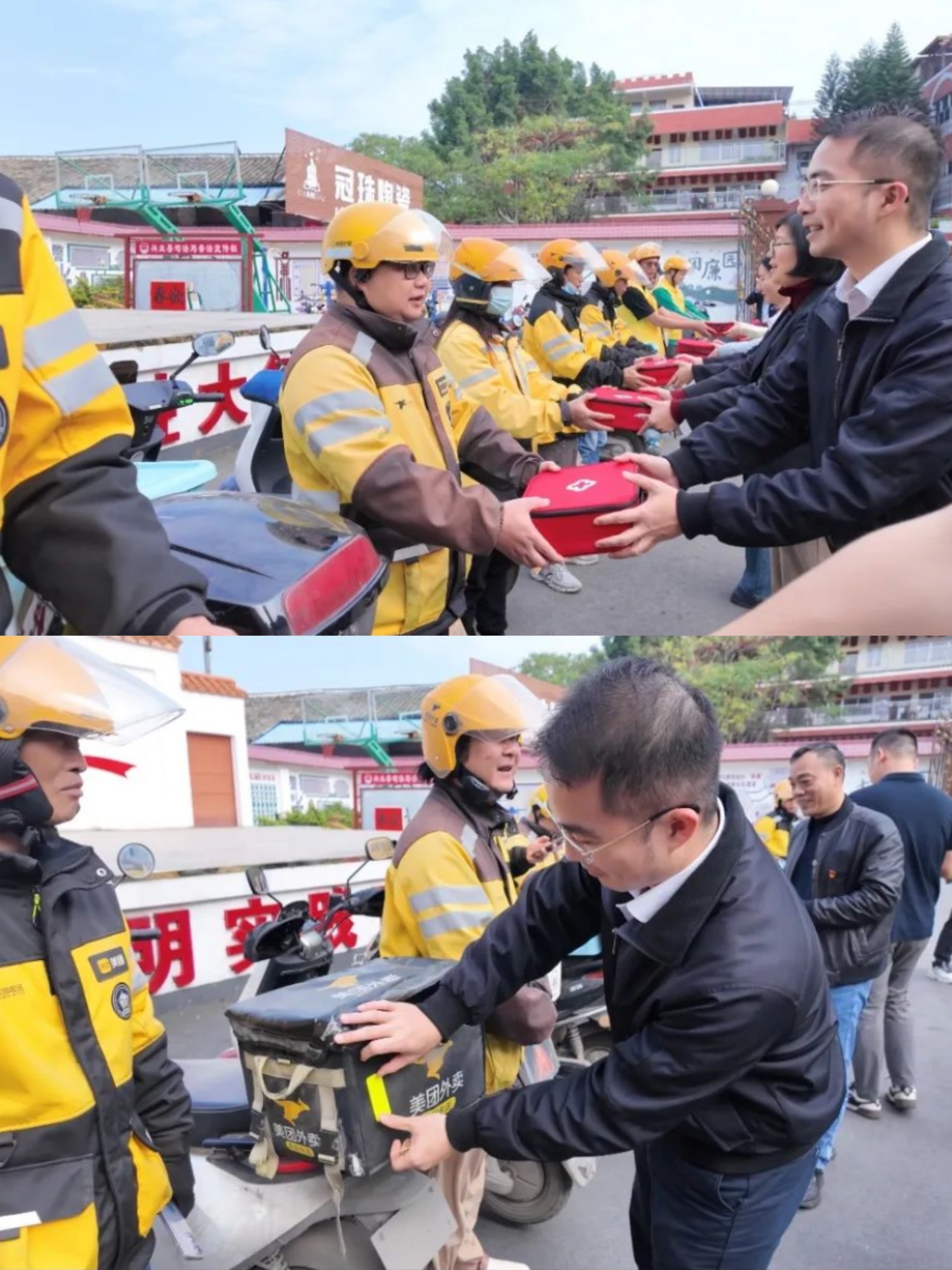 ▲ 为外卖从业青年代表送上暖心礼包,并为外卖车辆粘贴反光条