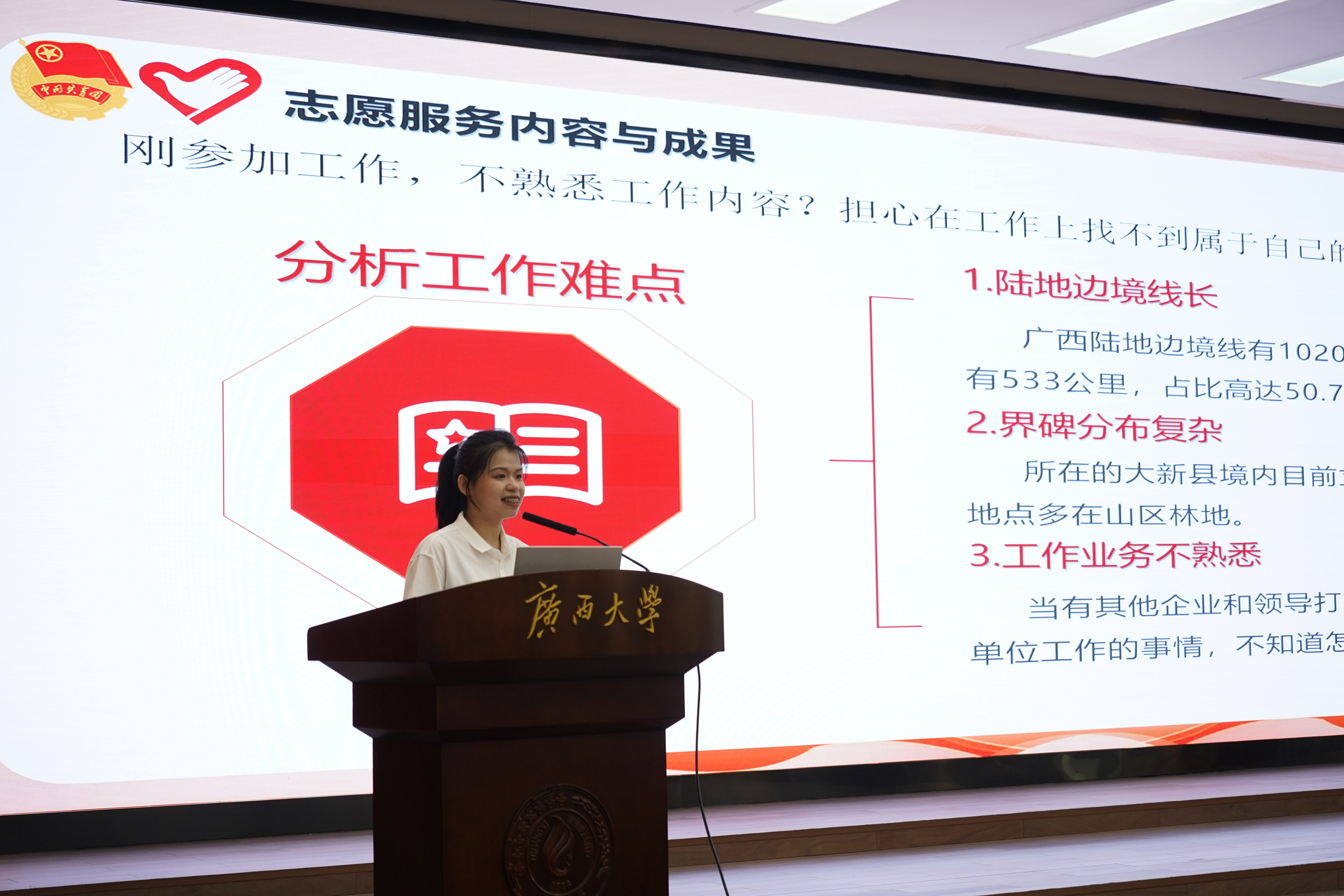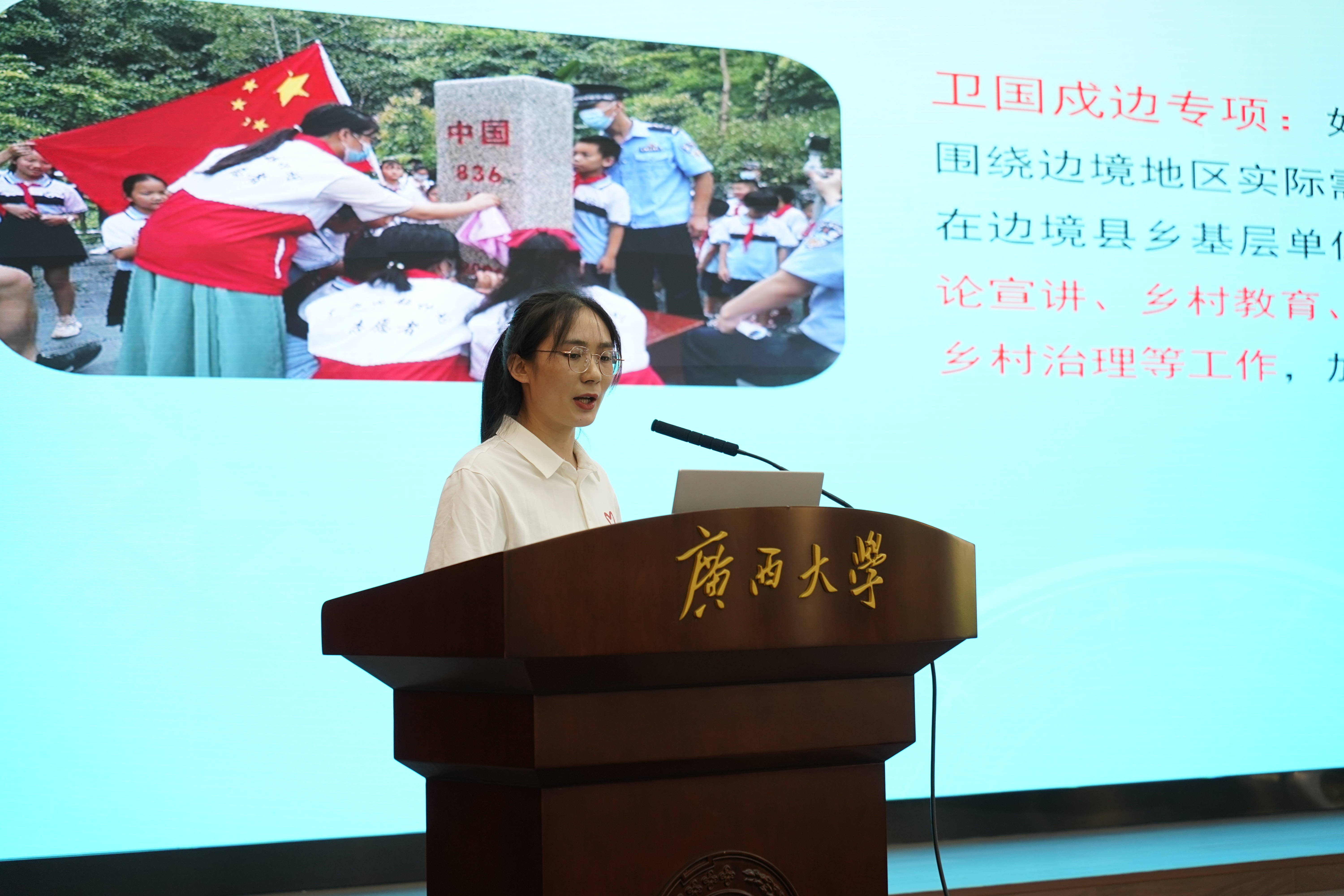 2024年西部计划志愿者黄艳琴,作为崇左市大新县首批西部计划卫国戍边专项青年护边指导员,分享了她用脚步丈量边境线的长度,以青年担当解决巡边工作中遇到的种种难题,将对祖国的热爱化作无畏的行动,鼓励同学们以家国情怀为弦,将个人青春融入国家发展。