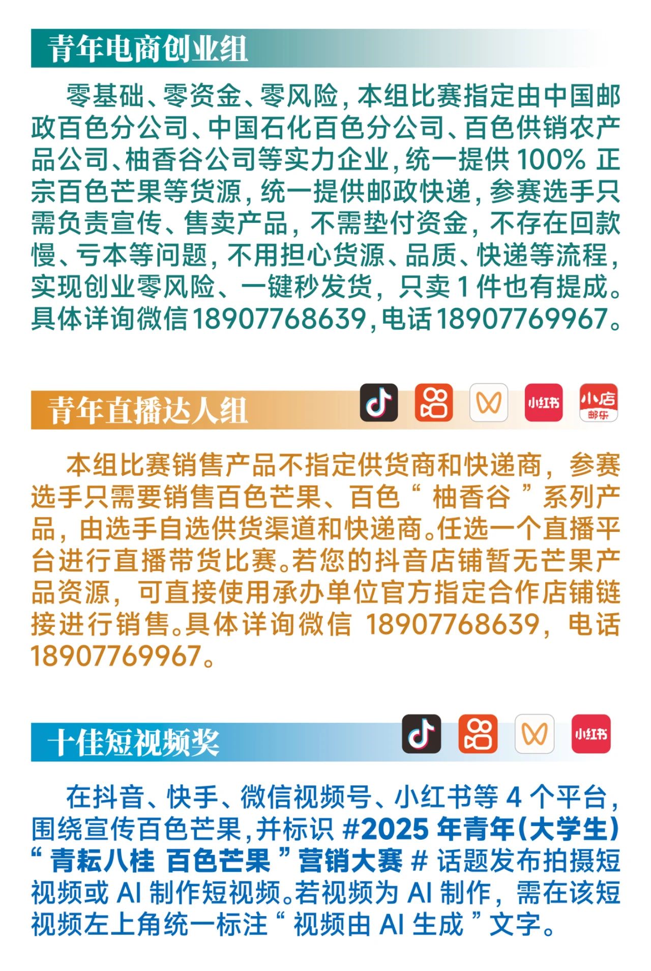 共青团广西区委、中共百色市委员会、百色市人民政府主办的2025年青年(大学生)“青耘八桂 百色芒果”营销大赛定于2025年6月25日—8月25日举行!欢迎18周岁—45周岁的在校大学生或社会青年踊跃参与!