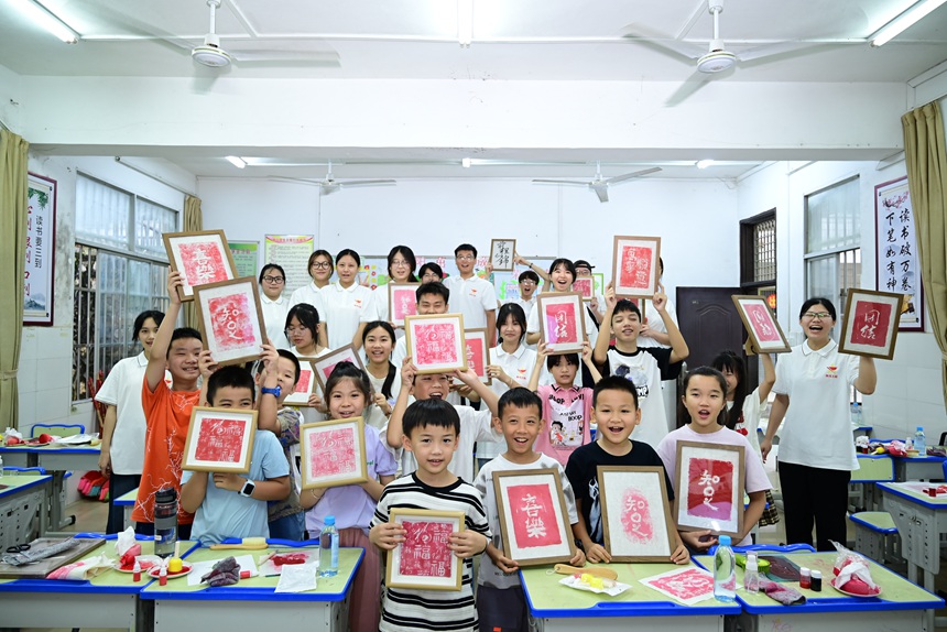 服务团用青年视角和话语,与边境线上多民族聚居地的少先队员开展互动式教学。通过中华民族一家亲稻谷画制作、百米画卷等边疆美育课堂、行走的非遗课堂,让孩子们领略中华文化的博大精深,更让民族团结之花在祖国南疆绚烂绽放。这些活动铸牢了中华民族共同体意识,激励着青年学子为中国式现代化挺膺担当,让青春在民族团结进步中闪耀光芒。