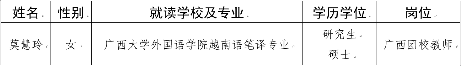 根据《广西壮族自治区人力资源和社会保障厅关于印发广西2025年度上半年事业单位统一公开招聘工作实施方案的通知》(桂人社发〔2025〕3号)和《广西团校〔中国(广西)国际青年交流学院〕2025年度公开招聘工作人员方案》的相关规定,经公开报名、资格审查、面试、考察和体检等程序,拟聘用莫慧玲同志为我校工作人员,现予以公示,公示期7个工作日(2025年7月29日至2025年8月6日)。