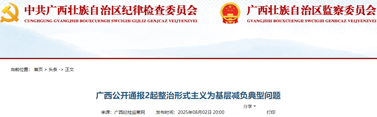 日前,广西壮族自治区层面整治形式主义为基层减负专项工作机制办公室会同自治区纪委办公厅、自治区层面深入贯彻中央八项规定精神学习教育工作专班,对2起整治形式主义为基层减负典型问题进行通报。具体如下: