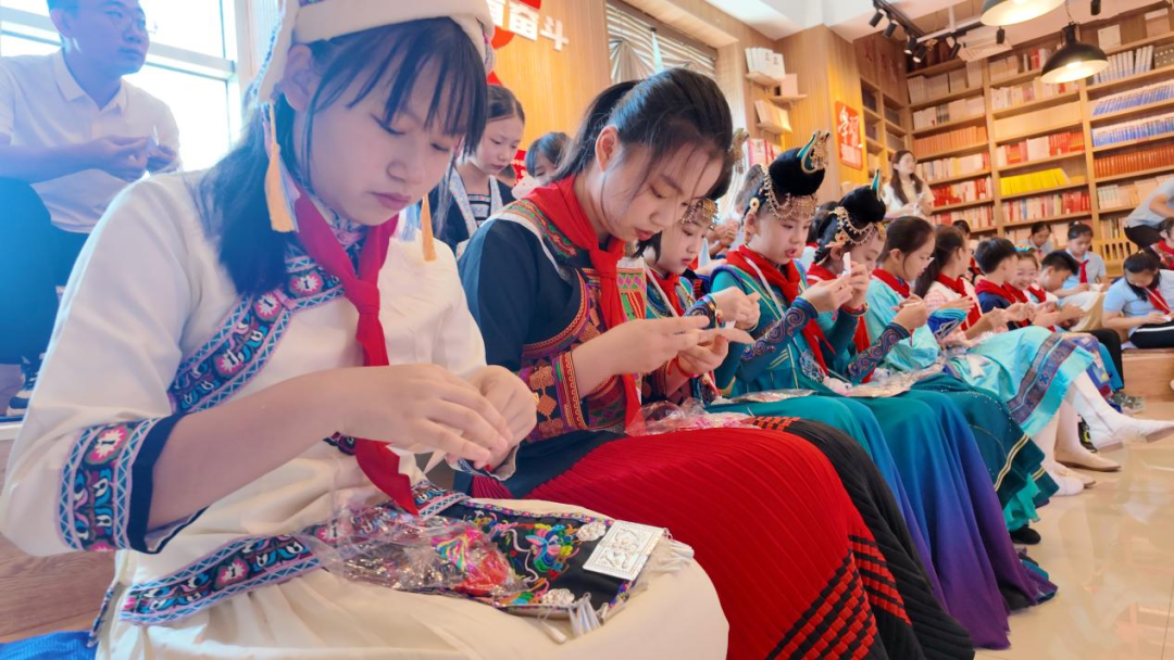 广西的少先队员们将象征友谊的绣球赠送给来自内蒙古的伙伴,满载祝福的绣球,承载着深厚的情谊,连接起两地孩子纯真的心。在“民族团结手工课”上,桂蒙两地的队员结为对子,携手制作广西非物质文化遗产“那莲赛巧节”的传统手工艺品——线角香包。大家两两配合,一起填香料、绕绣线,在一针一线中沉浸式体验传统文化的魅力。民族团结的美好情谊,也随着指尖的动作,悄悄织入了这小巧而精致的香包之中。这些生动有趣的互动实践,不仅让孩子们亲身感受到民族文化的多彩与深厚,更在协作中促进了各民族少年儿童之间的深入交流与情感融合。