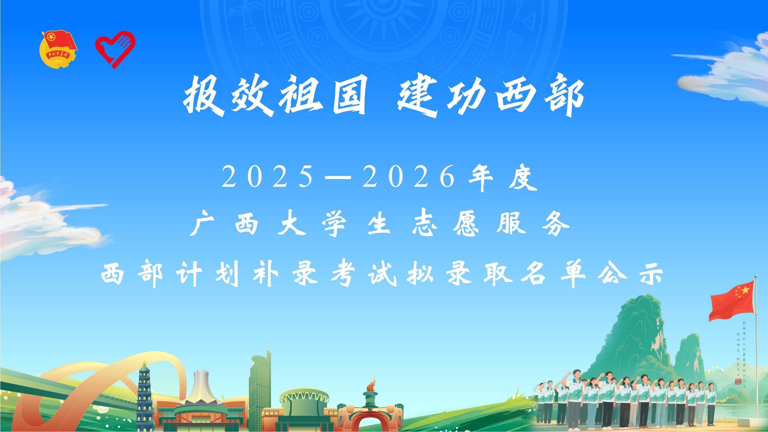 根据《共青团广西区委 自治区教育厅 自治区财政厅 自治区人力资源社会保障厅关于印发〈2025—2026年度广西大学生志愿服务西部计划实施方案〉的通知》(桂青联发〔2025〕10号)文件精神,通过笔试、面试、综合测评、体检等环节,拟录取肖钧文等30名西部计划志愿者(具体名单详见附件)赴广西区内基层单位开展志愿服务工作。