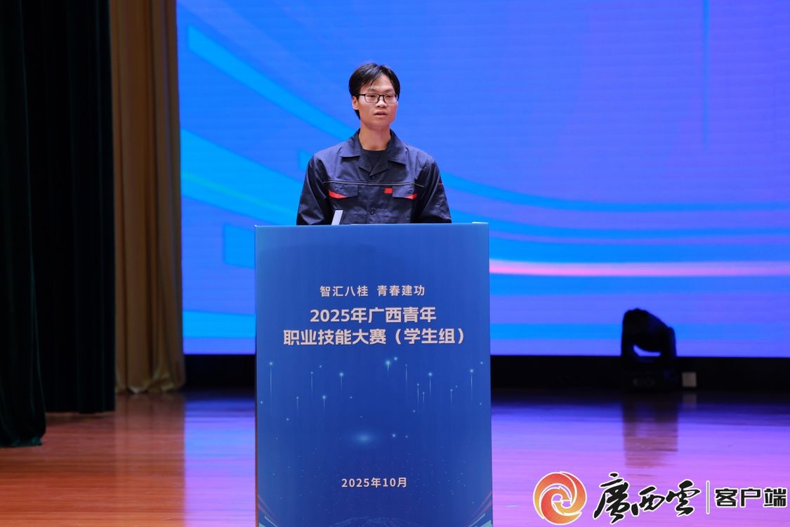 大赛选手代表、广西机电职业技术学院智装2401班顾绍航发言。通讯员玉韩摄