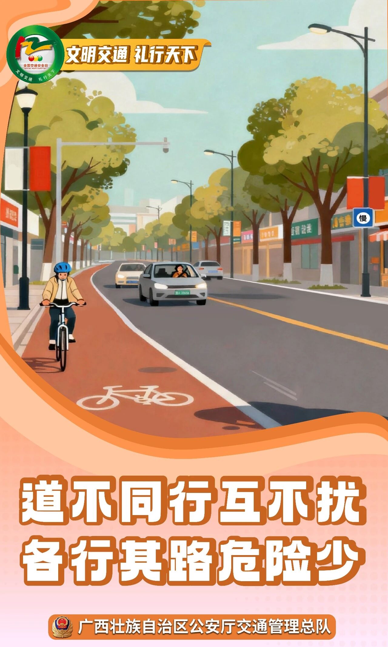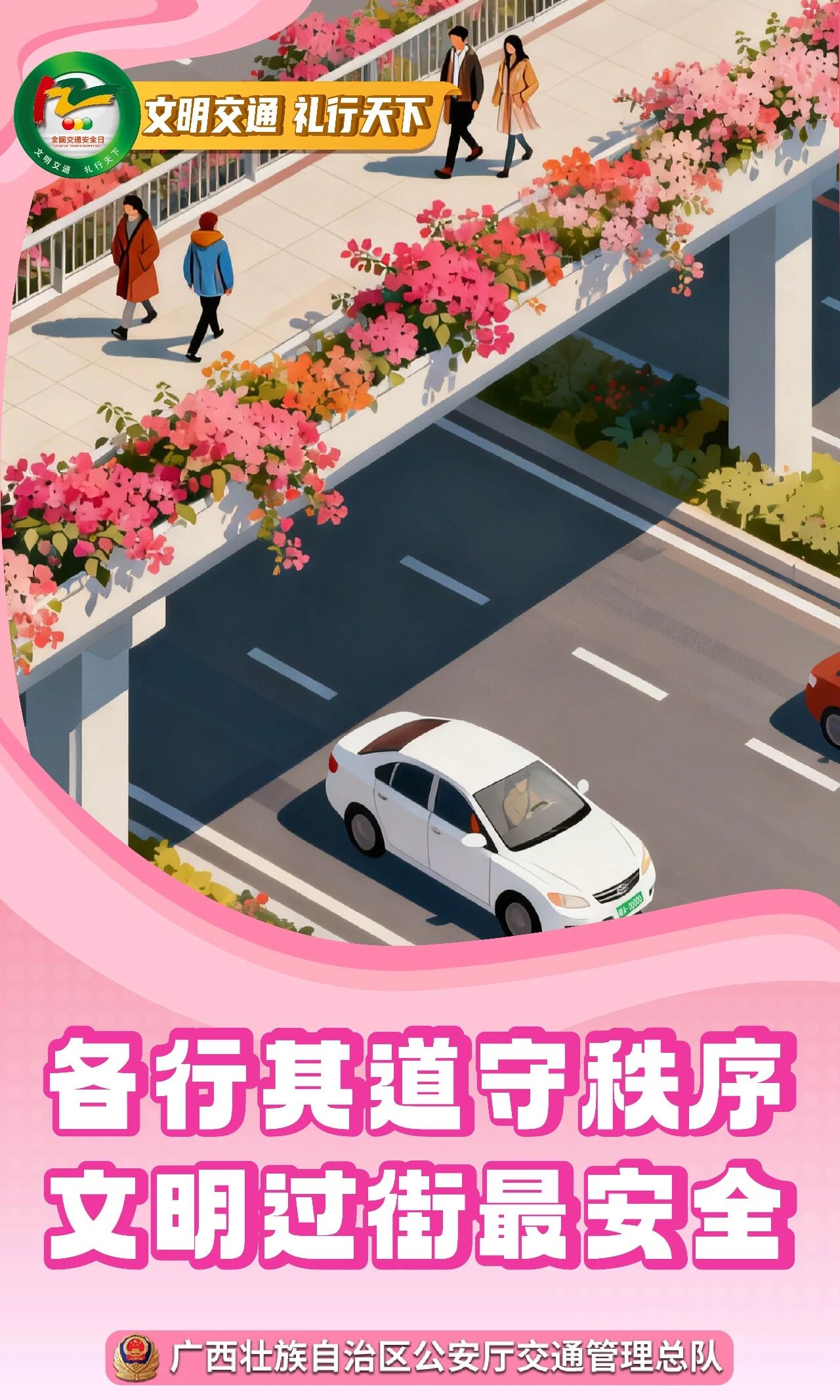 自2012年设立122“全国交通安全日”以来,历经13年的协同发展,在各行业、各部门的合力下,“全国交通安全日”已成为全社会普法宣法,弘扬文明交通,提升交通安全意识的文化品牌和有效载体。多年来,广西依托122“全国交通安全日”契机,持续开展文明交通行动计划、学生交通文明素养提升计划、高校联盟主题巡回宣讲等公益活动,在全国打造了具有广西特色的交通宣传品牌,得到全国同行认可和社会点赞,使广大人民群众享受到交通管理工作成果。