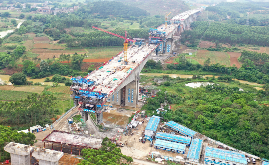▲4月18日,大塘至浦北高速公路平陆运河特大桥施工现场一派忙碌,大桥主体轮廓已经呈现。该高速公路是自治区统筹推进的重大交通基础设施建设项目,建成后将与南宁至北海等高速公路连接,成为通往广东的又一条便捷通道。广西日报记者 何学俏 通讯员 卜业夏 摄