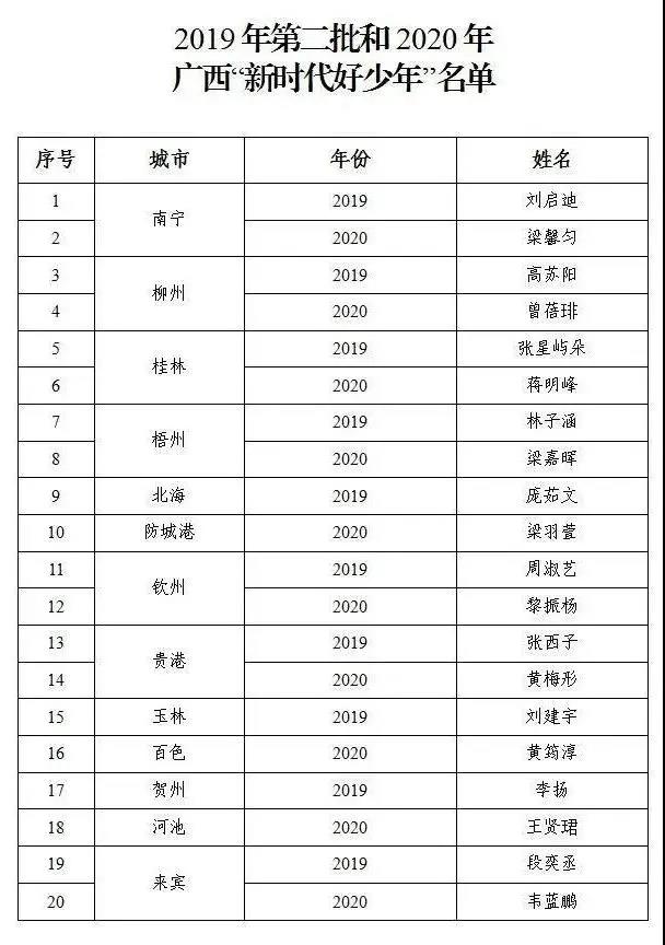 这些优秀少年是依据中央文明办有关文件精神和新时代好少年的评审标准,结合脱贫攻坚、新冠肺炎疫情防控等年度主题和广西实际,在各市各中小学广泛开展“新时代好少年”学习宣传活动中,涌现出来的先进典型,经过逐级推选、专家评审、媒体公示等严格程序产生的。