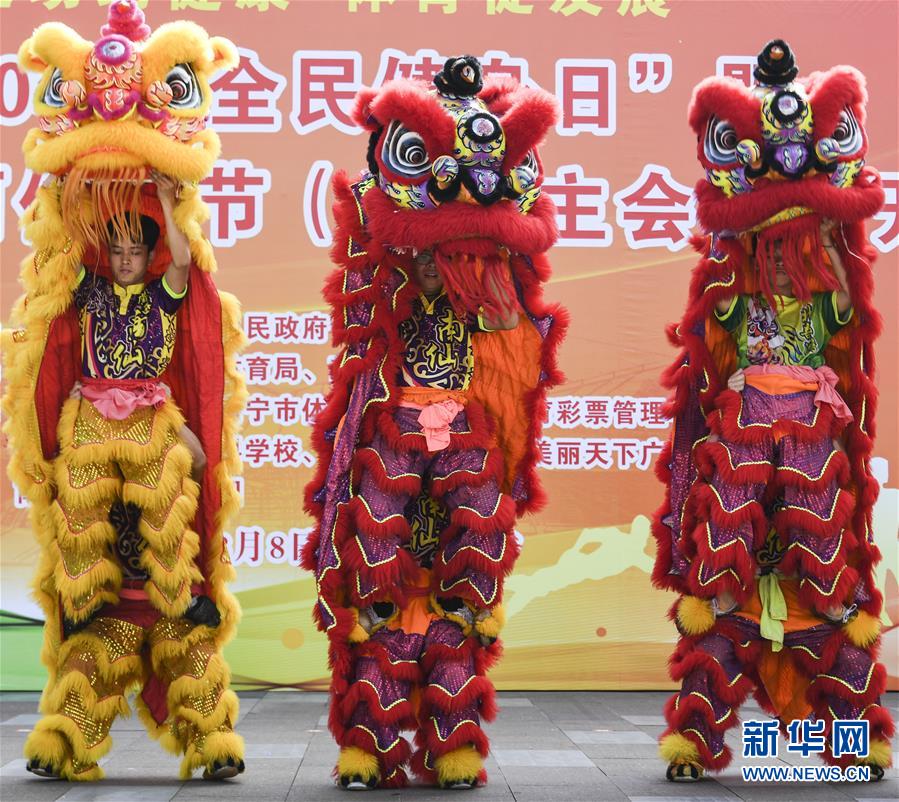 8月8日,市民在第十二届广西体育节南宁主会场表演舞狮。