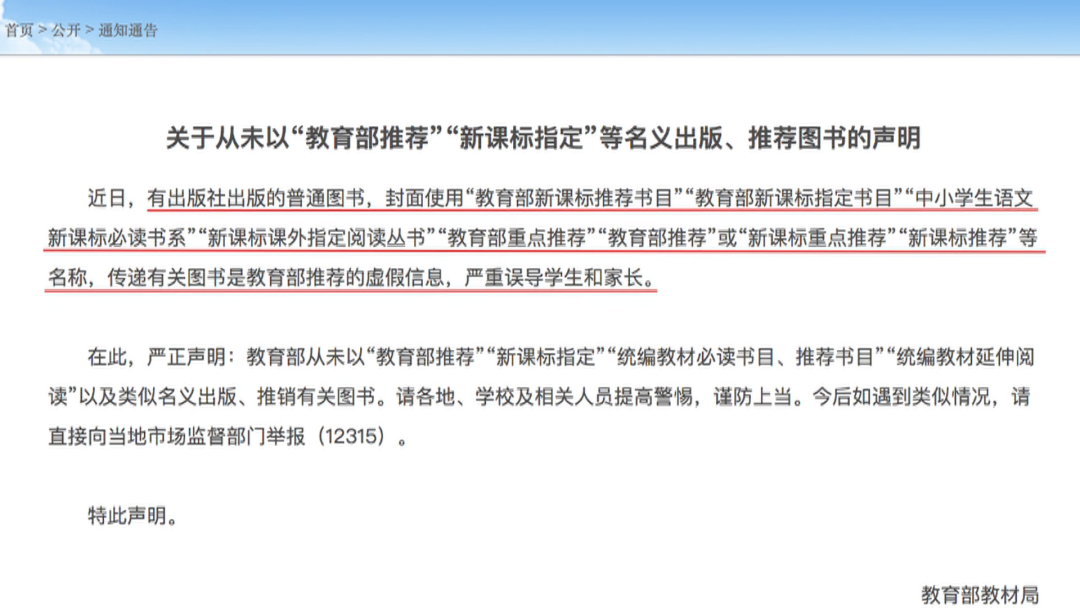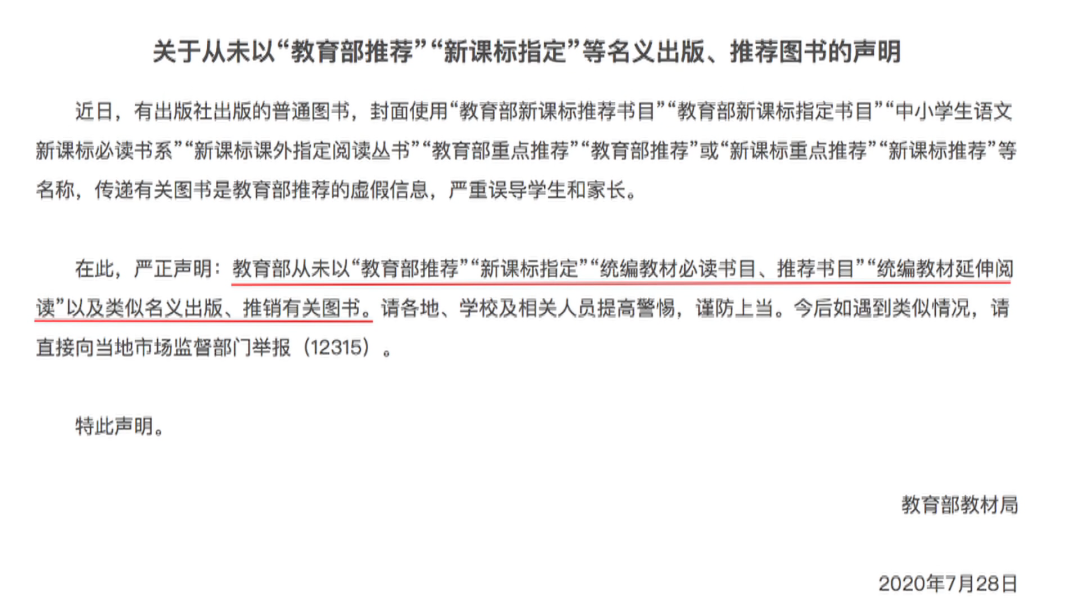7月28号,教育部发文表示,部分普通图书封面使用“教育部新课标推荐书目”“教育部新课标指定书目”“中小学生语文新课标必读书系”“新课标课外指定阅读丛书”“教育部重点推荐”“教育部推荐”或“新课标重点推荐”“新课标推荐”等名称,传递有关图书是教育部推荐的虚假信息,严重误导学生和家长。