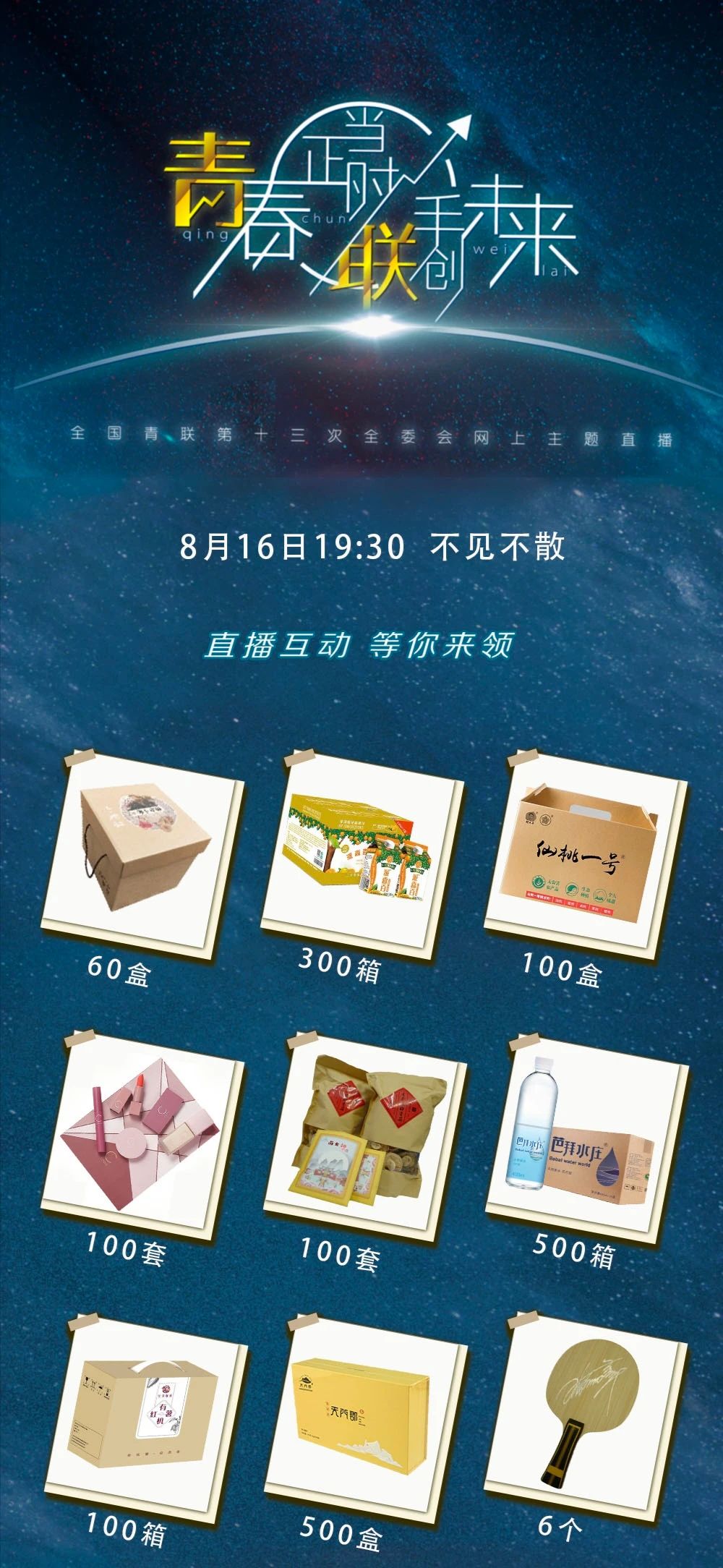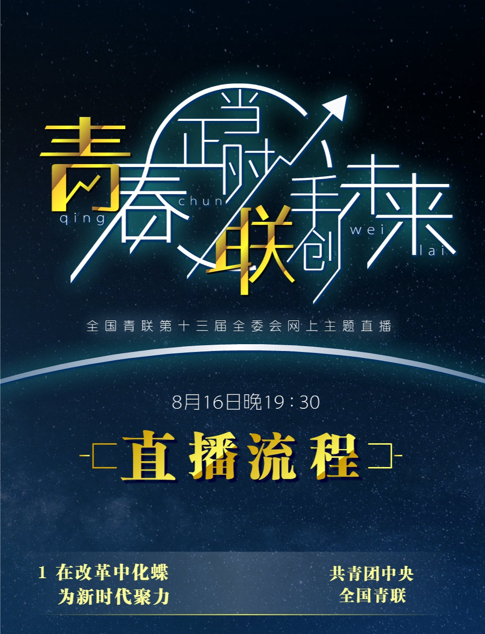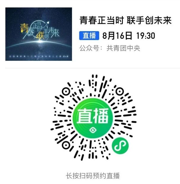 我们将于2020年8月16日19:30至23:00,通过“学习强国”学习平台、央视新闻客户端及@共青团中央 微信、微博、B站、快手、抖音、微视、斗鱼、虎牙、今日头条、百家号官方账号等平台开展“青春正当时,联手创未来”网上直播。请锁定8月16日晚19:30各平台直播间,感受理想家国,感知青春和未来,青春正当时,联手创未来,我们在路上!