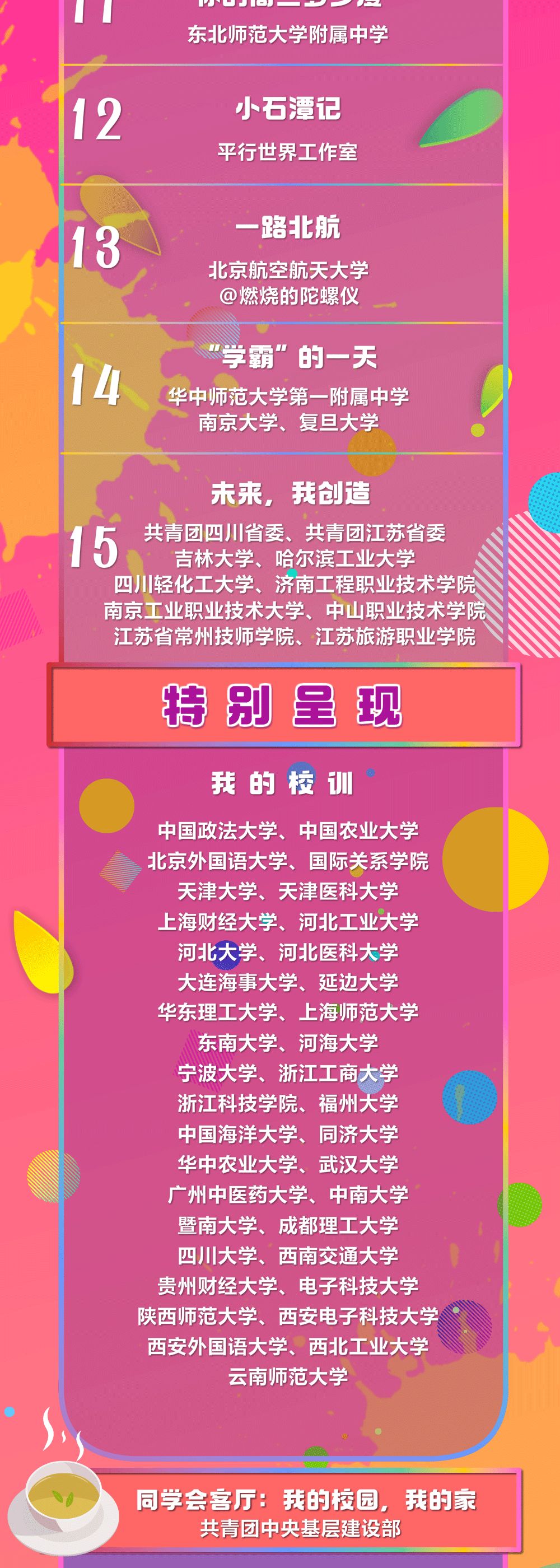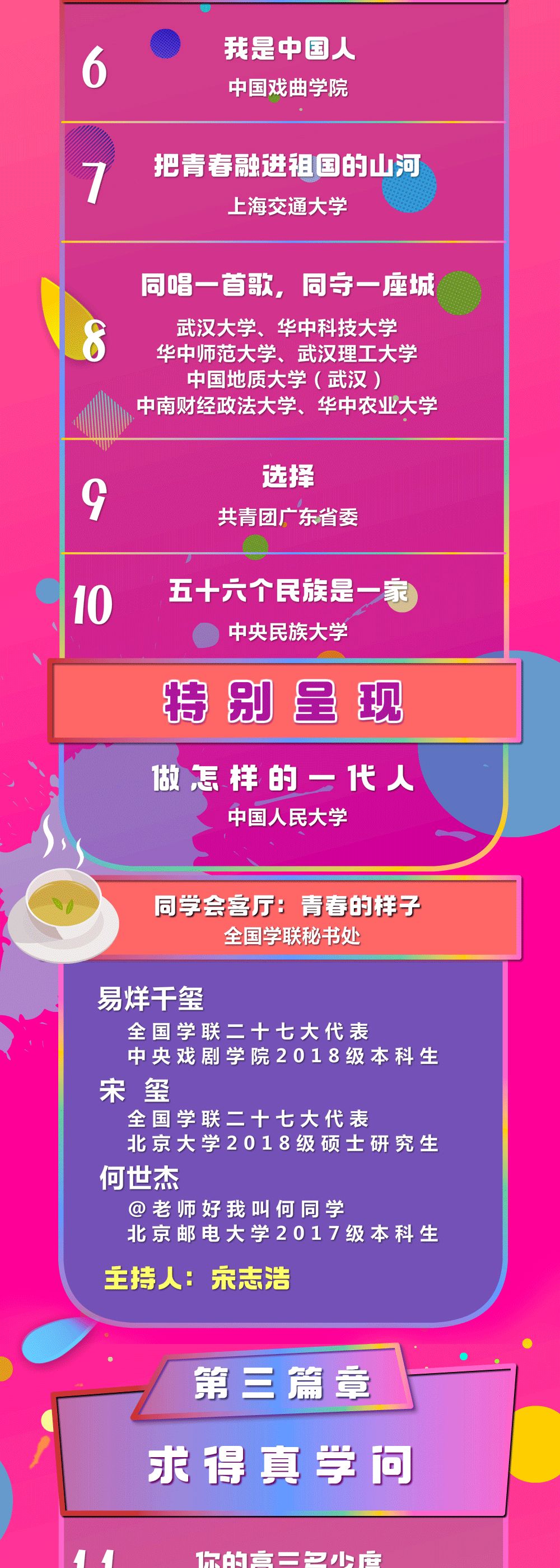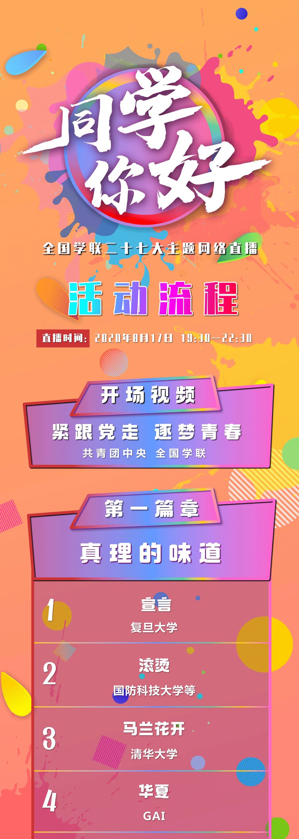 会议期间,我们将于2020年8月17日19:30,通过“学习强国”学习平台、央视新闻客户端及@共青团中央微信、微博、B站、快手、抖音、微视、斗鱼、虎牙、今日头条等官方账号及等平台开展主题网络直播活动,更多精彩,欢迎锁定!