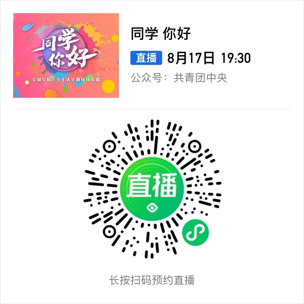 全国学联与你同拼搏,同前进,共享这场青春盛会。长按下方图片扫码预约直播吧,不见不散!