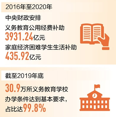 目前,全国1.54亿城乡义务教育阶段学生都享受着一份“大礼包”:免除学杂费、免费提供教科书,家庭经济困难学生还能补助生活费。2016年至2020年,中央财政共安排义务教育公用经费补助3931.24亿元,家庭经济困难学生生活补助435.92亿元,免费教科书补助712.13亿元。