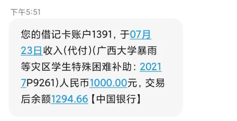 7月21日,广西大学学生工作处发出《关于开展暴雨等灾区学生家庭受灾情况排查和资助工作的通知》,开通绿色通道紧急资助河南省受灾家庭学生。