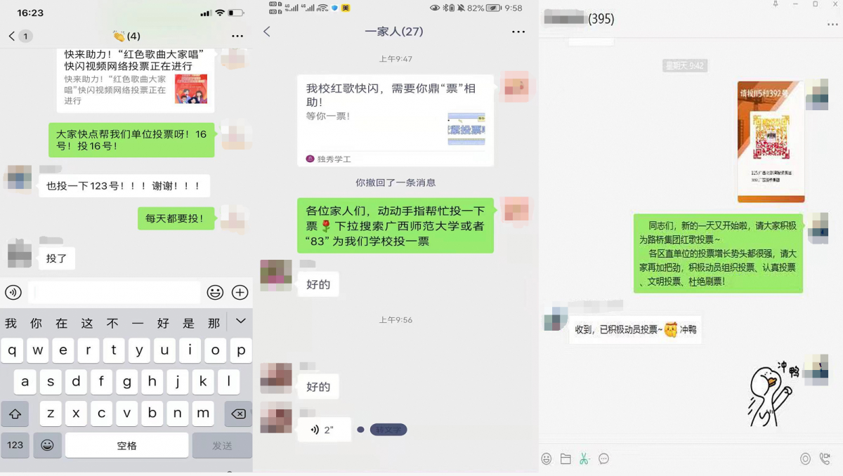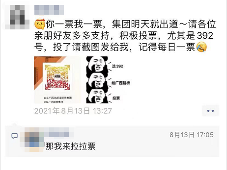 网络投票活动启动以来,参与单位在朋友圈、微信群聊的拉票活动也开展得有声有色。在各工作群、家人群、朋友群内,“请大家投xx号,为我们打call助力!”的拉票口号让亲朋好友们的投票热情高涨,不少人还将活动投票链接分享至微信朋友圈,鼓动亲朋好友帮忙投票助力,“你的一票至关重要,请为我们投票!”“请大家动动手指支持我们!”