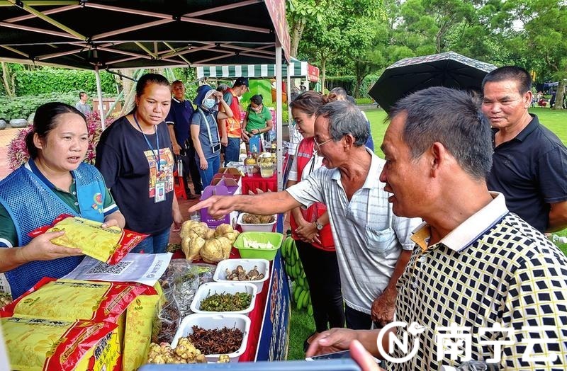 名特优农副产品展销会是丰收节活动一大看点。主办方邀请了约40家名特优农副产品商家及各县(市、区)乡村振兴驻村第一书记现场展销特色农产品,包括壮乡美食、名特优产品、丰收水果等。现场还通过宣传展板再现南宁市脱贫攻坚的奋斗过程。