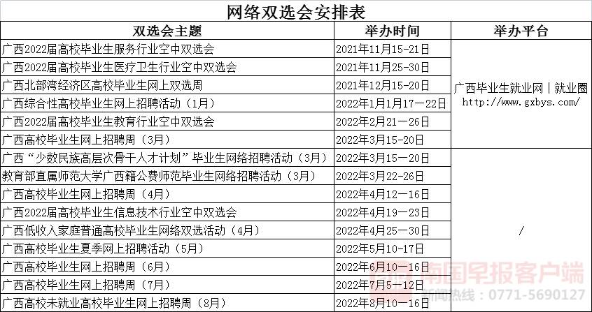从自治区教育厅获悉,为促进我区2022届普通高校毕业生充分就业,即日起至2022年8月份,教育厅将举办35场不同系列、不同类型的就业双选会。双选活动分不同主题,各用人单位和毕业生可根据自身实际需求选择参会。