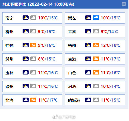 作者: | 时间: 2022年02月15日 09:27 | 来源: 中国天气网广西站 | 点击: 0 打印