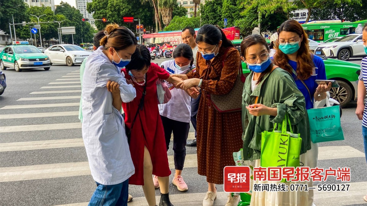 4月24日下午5时40分,一名老年人在经过南宁市桃源新民路口时,突然晕倒在地,路过的市民纷纷伸出援手。