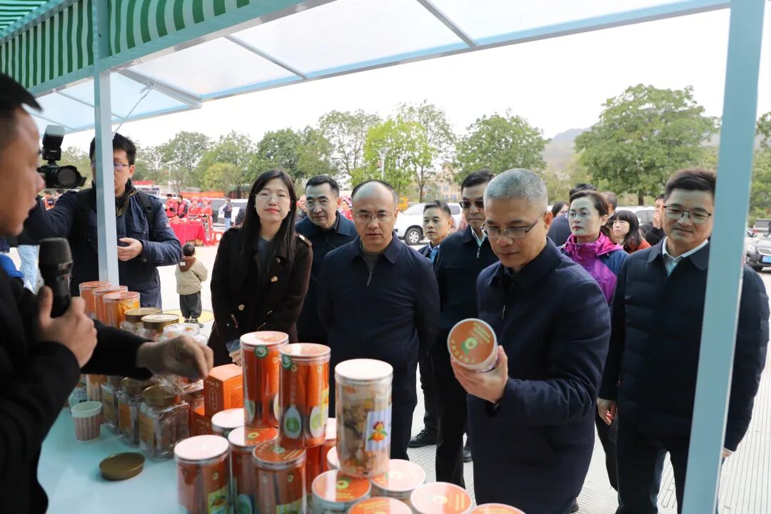 黄永忠、刘宇红、景东平在“交通兴农”展区了解特色农产品情况。